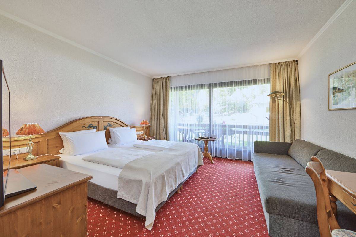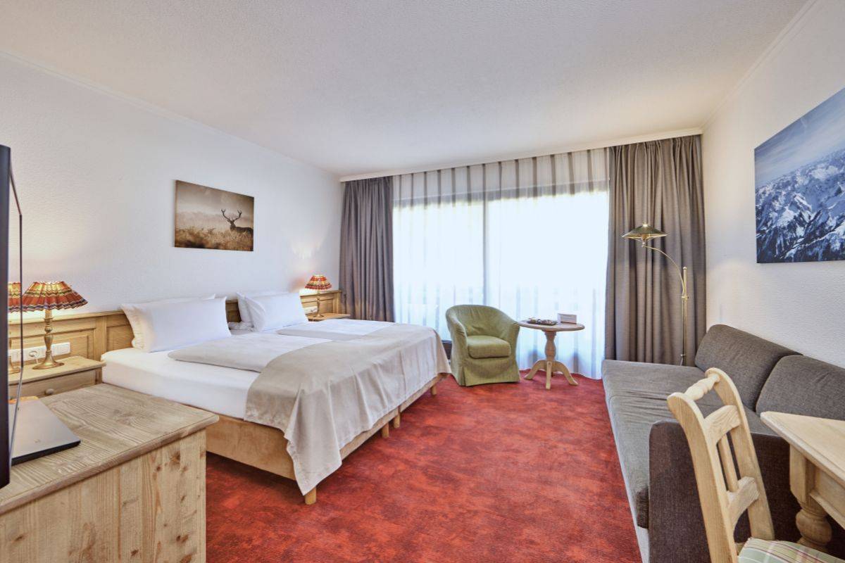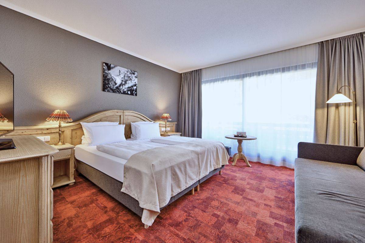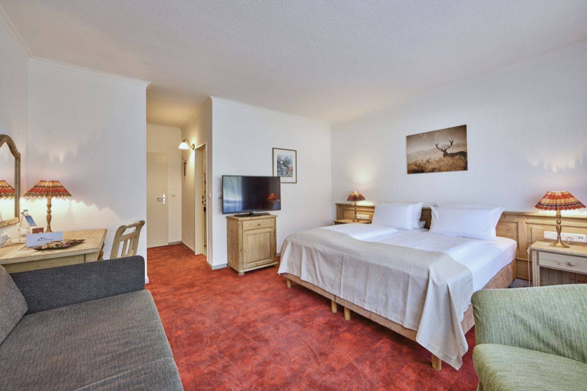 Geräumiges Standard-Doppelzimmer im Berghotel Hammersbach mit modernem Interieur und Design.